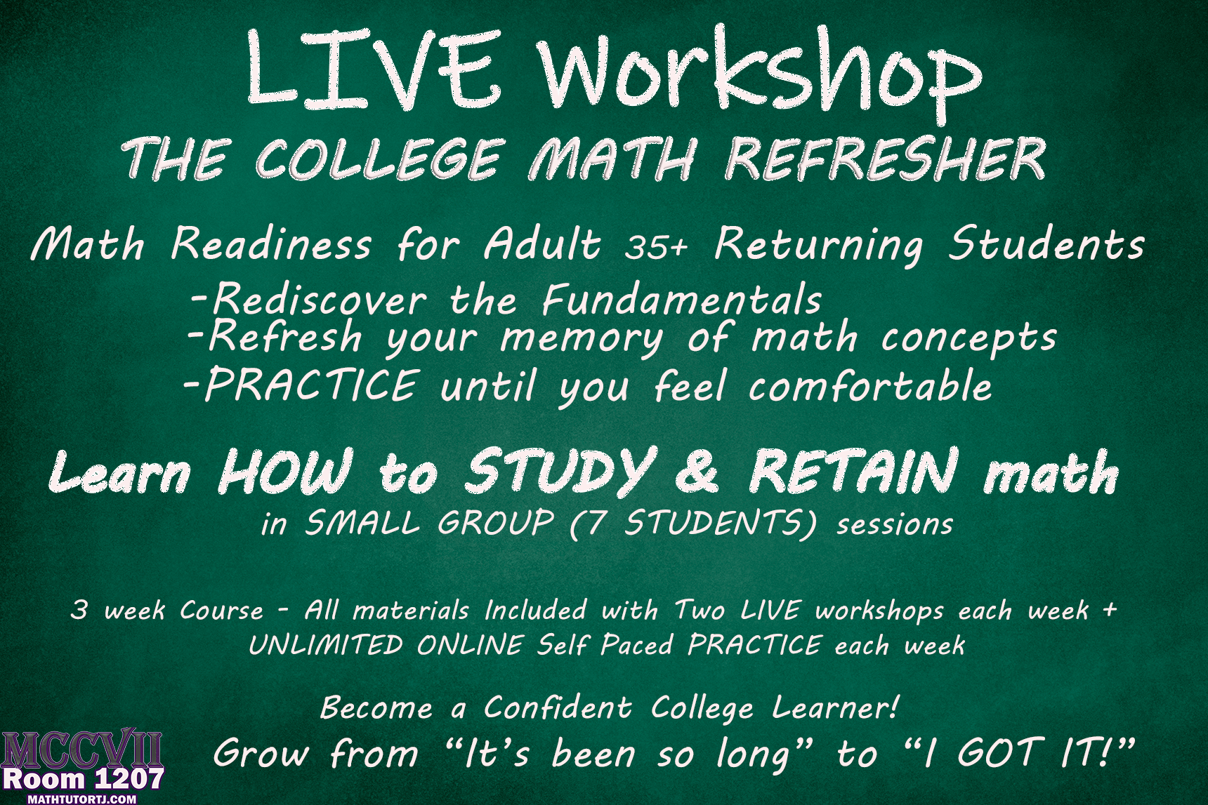 This quiz was created to gauge your preparedness for The College (Adult Math) Refresher Workshop. To gain the most benefit, strive to answer from your current knowledge. A calculator is permitted
